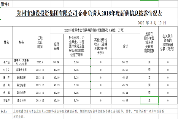 鄭州市建設(shè)投資集團有限公司企業(yè)負(fù)責(zé)人2018年度薪酬信息披露情況表